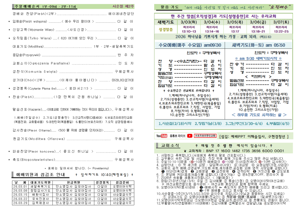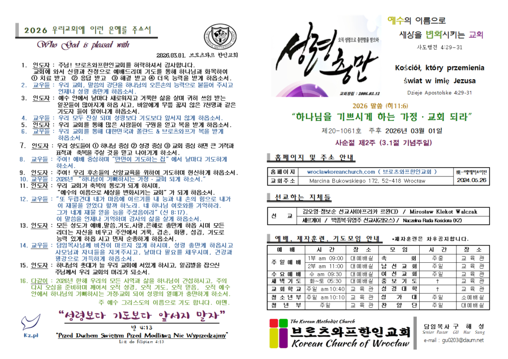 2026.2.28 주일예배 주보 Post published:2026년 03월 01일 Post category:주보 Post comments:0 Comments Read more articles Previous Post2025.3.16 주일예배 주보 답글 남기기 응답 취소CommentEnter your name or username to comment Enter your email address to comment Enter your website URL (optional) 다음 번 댓글 작성을 위해 이 브라우저에 이름, 이메일, 그리고 웹사이트를 저장합니다. Δ