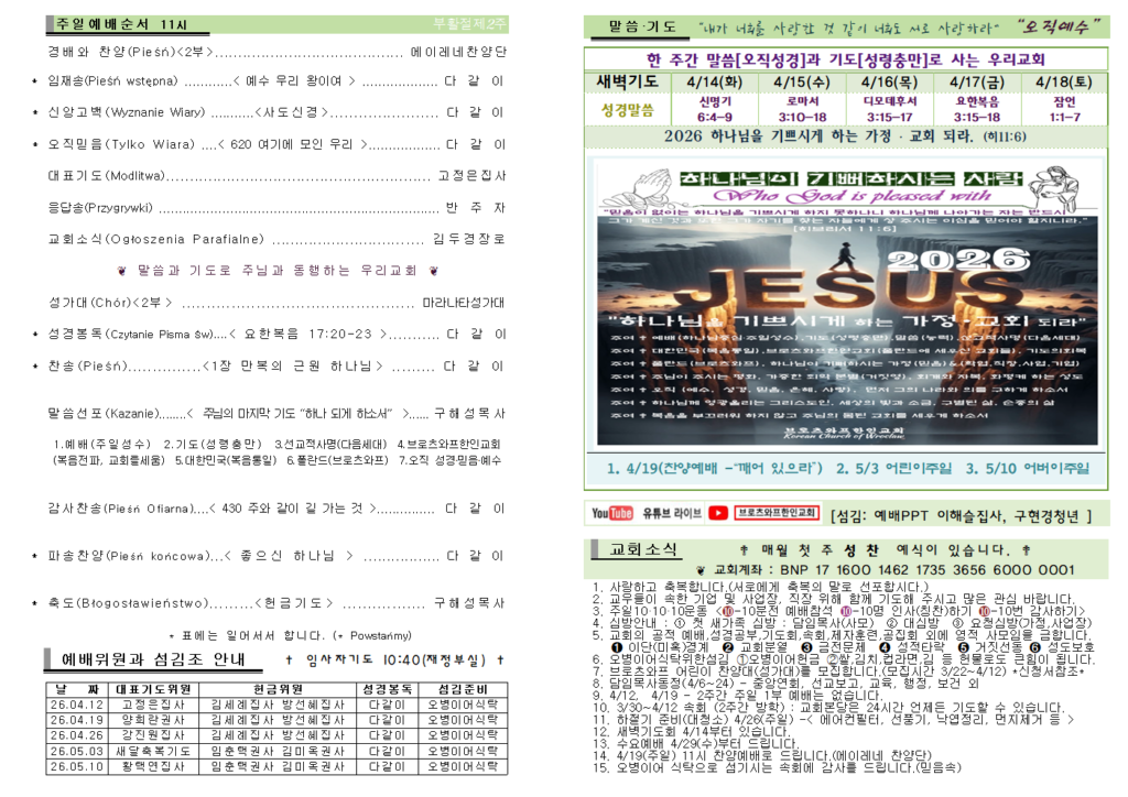 2026.4.12 주보 Post published:2026년 04월 13일 Post category:주보 Post comments:0 Comments Read more articles Previous Post2026.2.28 주일예배 주보 Next Post2026.4.19 주보 답글 남기기 응답 취소CommentEnter your name or username to comment Enter your email address to comment Enter your website URL (optional) 다음 번 댓글 작성을 위해 이 브라우저에 이름, 이메일, 그리고 웹사이트를 저장합니다. Δ